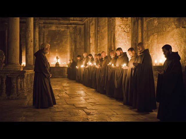A quiet night in the monastery, where monks gather in silence beneath the cross. Gentle Gregorian chants create a sacred atmosphere of prayer, peace, and deep reflection.